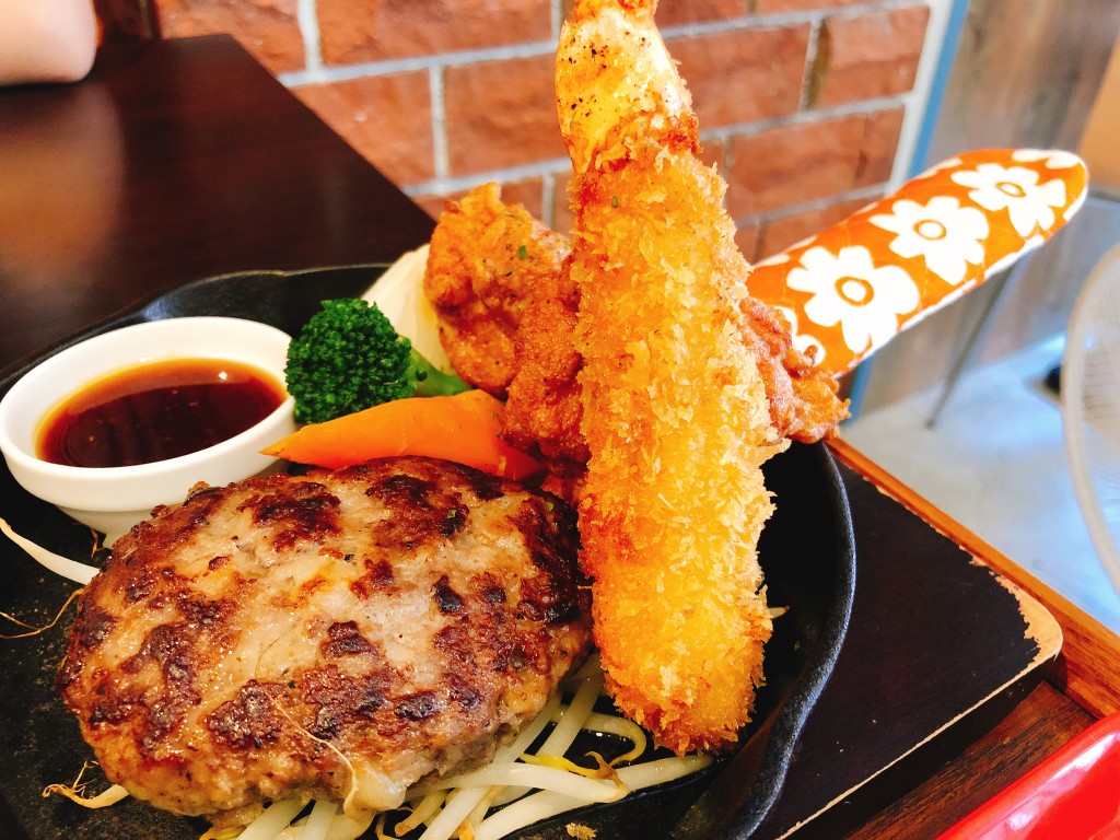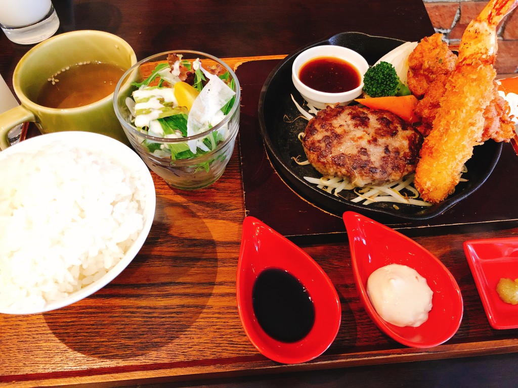 小ぶりのハンバーグは100gだけど、から揚げ2つと海老フライが付いてるからボリュームは満点。