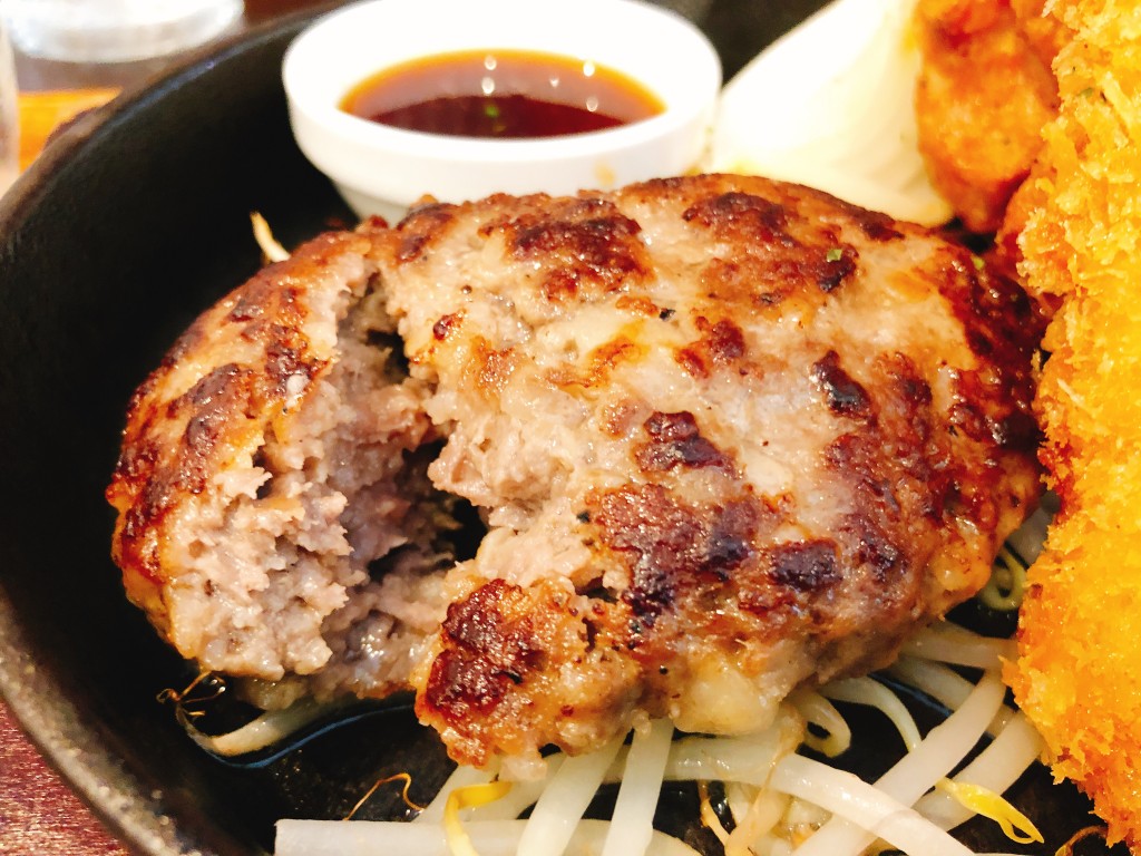 一口食べてみると、肉の味が濃ゆい!噛めば噛むほど肉の旨味と甘みが感じられる美味しいハンバーグ!