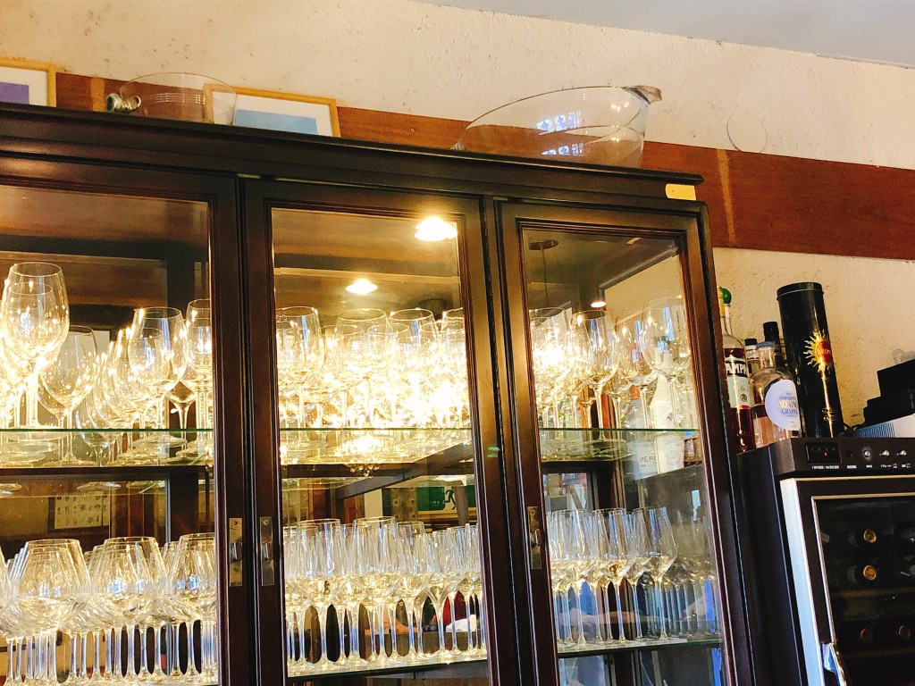 夜は本格イタリアンとワインを楽しめるお店になっており、数々のワイングラスとワインセラーが置いてある。