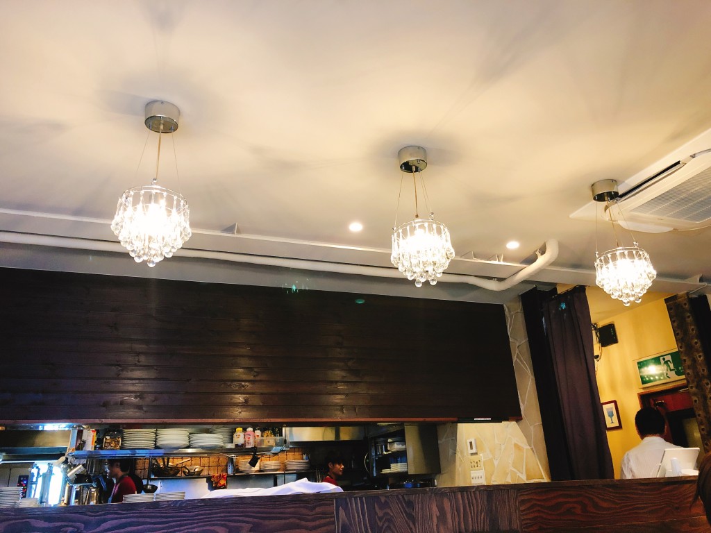 入り口の階段にもあったミニシャンデリアのようなライトがここにも並んでる。