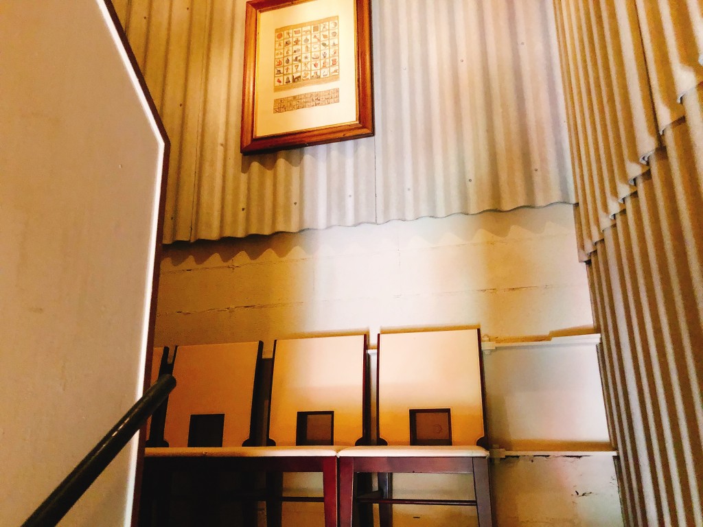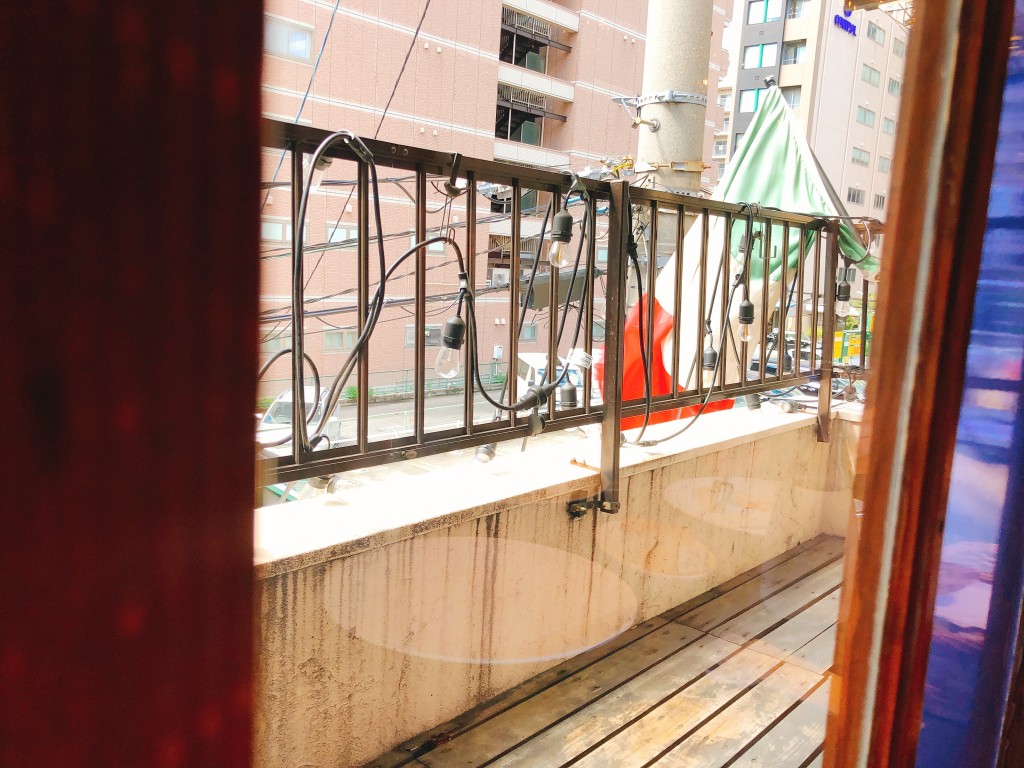 ちょうど座った席の真横がベランダになっていて、外の電球や旗が見える。