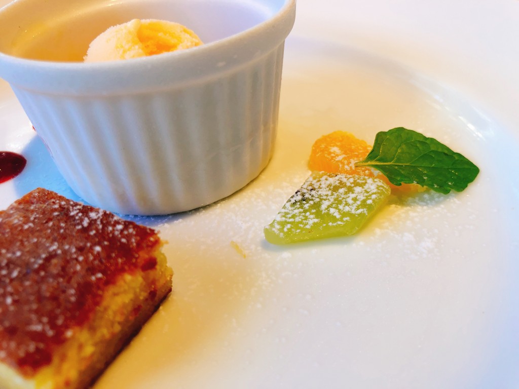 食後のデザートは自家製のバニラアイスとヘーゼルナッツのタルト。