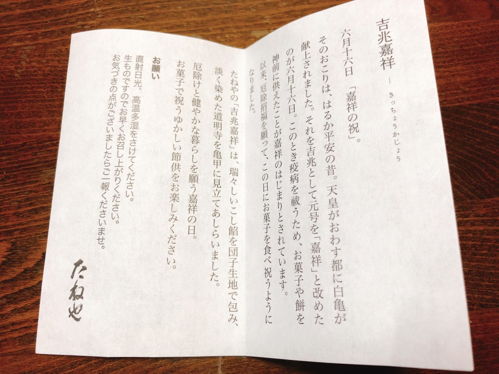中にはこのお菓子の名前の由来となった“嘉祥”の説明書きが入ってる。