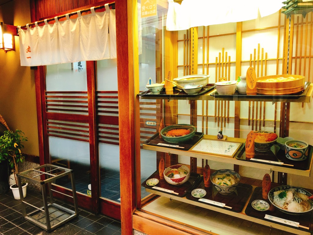 お店の入り口には、綺麗に飾られたサンプルと、古いながらもどこか上品なのれん。