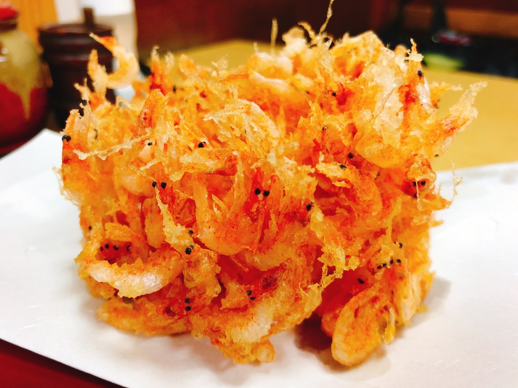 静岡・由比から取り寄せた新鮮な生桜えびを贅沢に使った揚げたてのかき揚げ天婦羅。大きくサクサクに揚げられた天婦羅は絶品で大人気メニューとなっている。