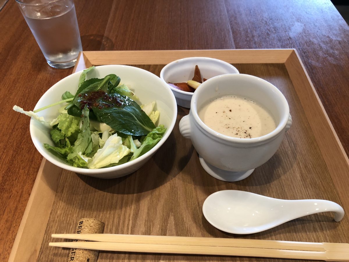 店内を眺めていると、すぐにサラダと冷製スープとピクルスがトレーに乗って出てきました。